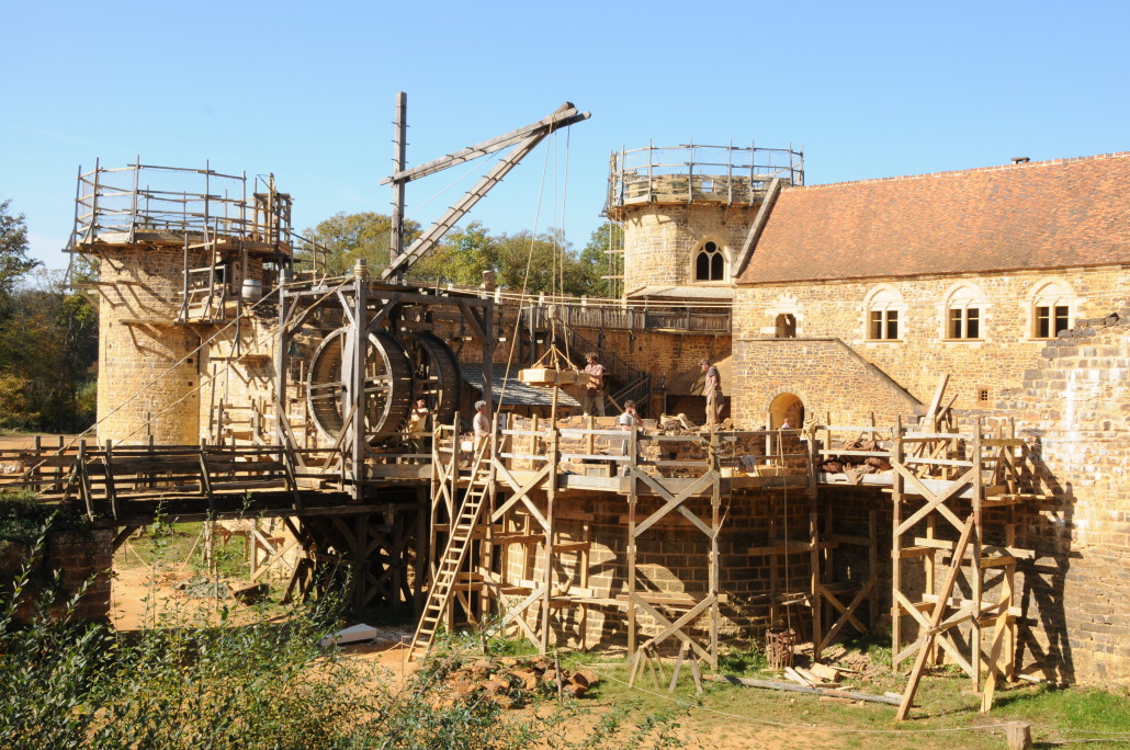La chapelle, le cellier, la salle de réception, les salles de tir ou encore la chambre des invités – ornée de peintures murales fabriquées à base de pigments – sont déjà ouverts aux visites. Cette nouvelle saison verra apparaître les premières charpentes en poivrière qui couvriront la tour de la chapelle (265 pièces de chêne seront levées une à une par les charpentiers). La fin des travaux du pigeonnier (le plancher sommital) et la réalisation de la porte principale entre les deux tours auront lieu cet été. Les tuiliers poursuivront la fabrication des tuiles, le moulage et la cuisson.
